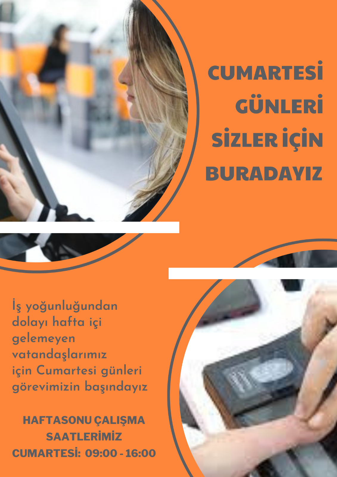31.12.2022 Cumartesi günleri 09:00-16:00 saatleri arasında 3'ü bir yerde ( T.C. Kimlik Kartı, Sürücü Belgesi ve Pasaport) işlemleri "Randevu Sistemi" ile yapılmaya devam edecektir.
