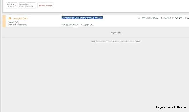 TOBB tarafından ilçemize yapılacak olan DİNAR TOBB 8 DERSLİKLİ ORTAOKUL YAPIM İŞİ için ihale ilana çıkmış 30.10.2023 tarih 10:00’ da ihale yapılarak inşaatına başlanacaktır. ” EKAP “ Sistemi üzerinden 2023/1056262 İhale Kayıt Numarası ile sistemden görüntülenebilecek olan ihale ilanımıza başvurabilirsiniz.