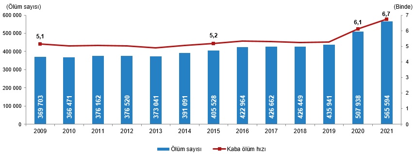 TUİK VERİLERİNE GÖRE; Ölüm sayısı 2020 yılında 507 bin 938 iken 2021 yılında %11,4 artarak 565 bin 594 oldu. Ölen kişilerin 2020 yılında %56,0'sını erkekler, %44,0'ünü kadınlar oluştururken 2021 yılında ölen kişilerin %54,6'sını erkekler, %45,4'ünü kadınlar oluşturdu. Kaba ölüm hızı binde 6,7 oldu Bin kişi başına düşen ölüm sayısını ifade eden kaba ölüm hızı, 2020 yılında binde 6,1 iken 2021 yılında binde 6,7 oldu. Diğer bir ifade ile 2020 yılında bin kişi başına 6,1 ölüm düşerken 2021 yılında bin kişi başına 6,7 ölüm düştü. Ölüm sayısı ve kaba ölüm hızı, 2009-2021