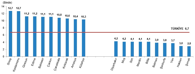 Kaba ölüm hızının en yüksek olduğu iller, binde 12,7 ile Sinop ve Kastamonu oldu Kaba ölüm hızının en yüksek olduğu iller, 2021 yılında binde 12,7 ile Sinop ve Kastamonu oldu. Bu illeri binde 11,2 ile Giresun ve Edirne, binde 11,1 ile Balıkesir ve Çankırı, binde 10,8 ile Çanakkale izledi. Kaba ölüm hızının en düşük olduğu il ise binde 2,8 ile Şırnak oldu. Bu ili binde 3,0 ile Hakkari, binde 3,7 ile Van ve binde 3,8 ile Şanlıurfa izledi. Kaba ölüm hızının en yüksek ve en düşük olduğu 10 il, 2021