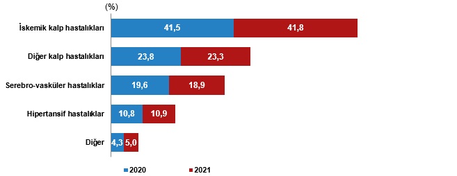 Dolaşım sistemi hastalıkları kaynaklı ölümlerin %41,8'ini iskemik kalp hastalığı oluşturdu Dolaşım sistemi hastalıklarından kaynaklı ölümler alt ölüm nedenlerine göre incelendiğinde, ölenlerin %41,8'inin iskemik kalp hastalıklarından, %23,3'ünün diğer kalp hastalıklarından, %18,9'unun serebro-vasküler hastalıklardan öldüğü görüldü. Dolaşım sistemi hastalıklarından ölenlerin oranı, 2020, 2021