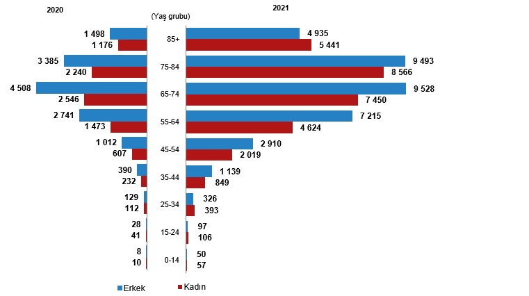 COVID-19 kaynaklı ölümler yaş grubuna göre incelendiğinde, COVID-19 kaynaklı ölümlerin 2020 yılında en fazla olduğu yaş grubunun 65-74, 2021 yılında ise 75-84 olduğu görüldü. COVID-19 nedeniyle 2021 yılında 75-84 yaş grubunda ölenlerin 9 bin 493'ünü erkekler, 8 bin 566'sını kadınlar oluşturdu. Yaş grubu ve cinsiyete göre COVID-19 kaynaklı ölümler, 2020, 2021