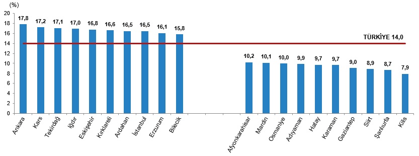 Grafikteki rakamlar, yuvarlamadan dolayı toplamı vermeyebilir. İyi ve kötü huylu tümörlerden kaynaklı ölümlerin en yüksek olduğu il, %17,8 ile Ankara oldu İyi ve kötü huylu tümörlerden ölenler illere göre incelendiğinde, 2021 yılında iyi ve kötü huylu tümörlerden kaynaklı ölüm oranının en yüksek olduğu il %17,8 ile Ankara oldu. Bu ili %17,2 ile Kars, %17,1 ile Tekirdağ, 17,0 ile Iğdır izledi. İyi ve kötü huylu tümörlerden kaynaklı ölüm oranının en düşük olduğu il ise %7,9 ile Kilis oldu. Bu ili %8,7 ile Şanlıurfa, %8,9 ile Siirt, %9,0 ile Gaziantep izledi. İyi ve kötü huylu tümörlerden kaynaklı ölümlerin en yüksek ve en düşük olduğu 10 il, 2021