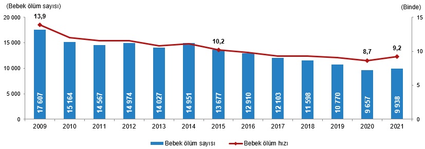 Bebek ölüm hızı binde 9,2 oldu Bebek ölüm sayısı, 2020 yılında 9 bin 657 iken 2021 yılında 9 bin 938 oldu. Bin canlı doğum başına düşen bebek ölüm sayısını ifade eden bebek ölüm hızı, 2020 yılında binde 8,7 iken 2021 yılında binde 9,2 oldu. Diğer bir ifade ile 2021 yılında bin canlı doğum başına 9,2 bebek ölümü gerçekleşti. Bebek ölüm sayısı ve hızı, 2009-2021