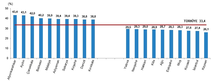 Grafikteki rakamlar, yuvarlamadan dolayı toplamı vermeyebilir. Dolaşım sistemi hastalıkları kaynaklı ölümlerin en yüksek olduğu il, Afyonkarahisar oldu Dolaşım sistemi hastalıklarından ölenler illere göre incelendiğinde, 2021 yılında dolaşım sistemi hastalıklarına bağlı ölüm oranının en yüksek olduğu il %43,4 ile Afyonkarahisar oldu. Bu ili %43,1 ile Aydın, %42,0 ile Çanakkale, %40,2 ile Balıkesir izledi. Dolaşım sistemi hastalıklarına bağlı ölüm oranının en düşük olduğu il ise %26,1 ile Kayseri oldu. Bu ili %27,4 ile İstanbul, %27,6 ile Kocaeli, %28,3 ile Muş ve Eskişehir izledi. Dolaşım sistemi hastalıkları kaynaklı ölümlerin en yüksek ve en düşük olduğu 10 il, 2021