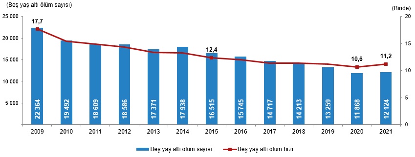 Beş yaş altı ölüm hızı binde 11,2 oldu Doğumdan sonraki beş yıl içinde ölme olasılığını ifade eden beş yaş altı ölüm hızı, 2020 yılında 10,6 iken 2021 yılında binde 11,2 oldu. Beş yaş altı ölüm sayısı ve hızı, 2009-2021