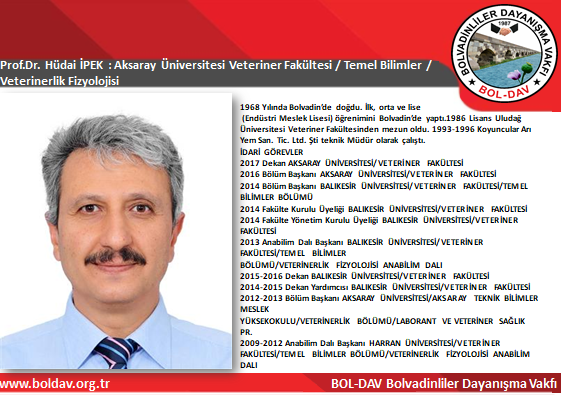 AKADEMİSYEN DEĞERLERİMİZProf. Dr. Hüdai İPEK Kimdir:?1968 Yılında Bolvadin’de doğdu. İlk, orta ve lise (Endüstri Meslek Lisesi) öğrenimini Bolvadin’de yaptı.1986 Lisans Uludağ Üniversitesi Veteriner Fakültesinden mezun oldu. 1993-1996 Koyuncular Arı Yem San. Tic. Ltd. Şti teknik Müdür olarak çalıştı.İDARİ GÖREVLER2017 Dekan AKSARAY ÜNİVERSİTESİ/VETERİNER FAKÜLTESİ2016 Bölüm Başkanı AKSARAY ÜNİVERSİTESİ/VETERİNER FAKÜLTESİ2014 Bölüm Başkanı BALIKESİR ÜNİVERSİTESİ/VETERİNER FAKÜLTESİ/TEMEL BİLİMLER BÖLÜMÜ2014 Fakülte Kurulu Üyeliği BALIKESİR ÜNİVERSİTESİ/VETERİNER FAKÜLTESİ2014 Fakülte Yönetim Kurulu Üyeliği BALIKESİR ÜNİVERSİTESİ/VETERİNER FAKÜLTESİ2013 Anabilim Dalı Başkanı BALIKESİR ÜNİVERSİTESİ/VETERİNER FAKÜLTESİ/TEMEL BİLİMLERBÖLÜMÜ/VETERİNERLİK FİZYOLOJİSİ ANABİLİM DALI2015-2016 Dekan BALIKESİR ÜNİVERSİTESİ/VETERİNER FAKÜLTESİ2014-2015 Dekan Yardımcısı BALIKESİR ÜNİVERSİTESİ/VETERİNER FAKÜLTESİ2012-2013 Bölüm Başkanı AKSARAY ÜNİVERSİTESİ/AKSARAY TEKNİK BİLİMLER MESLEKYÜKSEKOKULU/VETERİNERLİK BÖLÜMÜ/LABORANT VE VETERİNER SAĞLIK PR.2009-2012 Anabilim Dalı Başkanı HARRAN ÜNİVERSİTESİ/VETERİNER FAKÜLTESİ/TEMEL BİLİMLER BÖLÜMÜ/VETERİNERLİK FİZYOLOJİSİ ANABİLİM DALIProjelerde Yaptığı Görevler:1 Köpeklerde Deneysel Oluşturulan Bilateral Üreteral Obstrüksiyonun Bazı Kan ve BiyokimyasalParametrelere Etkisi, BAP, Yönetici, 2002-2003 (ULUSAL) 1.Koyunlarda Tiletamin Zolazepam Ksilazin Tiletamin Zolazepam ve Fentanil Tiletamin Zolazepam Anestezisinin Klinik Hematolojik ve Biyokimyasal Etkilerinin Araştırılması, BAP, Araştırmacı, 2002-2003 (ULUSAL)2.3. Kekliklerde Normal Kan Parametreleri, BAP, Araştırmacı, 2000-2001 (ULUSAL)Yumurtacı Tavukların Yumurta Verimi ve Bazı Kan Parametreleri Üzerine Rasyondaki Vitamin A ve Çinkonun Etkisi, BAP, Araştırmacı, 1998-2000 (ULUSAL) 4.Eserler:Uluslararası Hakemli Dergilerde Yayımlanan Makalelerin Bazıları:1. ÇAMKERTEN GÜZİN,ÇAMKERTEN İLKER,ÜN HİKMET,BALKAN BURCU MENEKŞE,İPEKHÜDAİ,TAŞKIN ABDULLAH,ŞAHİN TEKİN (2018). Oxidant-antioxidant status in bovine ephemeral fever. Indian Journal of Animal Research, Doi: DOI: 10.18805/ijar.B-806 (Yayın No: 4621712)2. Ipek H, Sındak N, Ozkurt G, Gokcen A, Biricik H.S (2013). Physiological values of tear secretions in Bozova greynhounds according to gender and age 12 5 589 592 2013. Journal of Animal and Veterinary Advances, 12(5), 589-592. (Yayın No: 896850)3. Ipek H, Avci M, Aydilek N, Yerturk M (2012). The effect of zeolite on oxidant antioxidant status in healthy dairy cows. Acta Vet Brno, 81(1), 43-47. (Yayın No: 896560) Uluslararası Hakemli Dergilerde Yayımlanan Makaleler Bazıları:7. Ceylan C, Ipek H, Hayat A, Aydilek N (2007). The anesthetic effects of tiletamine zolazepam alone with xylazine or fentanyl in sheep 84 38 40 2007. Indian Veterinary Journal, 84(1), 38-40. (Yayın No: 896015)8. H İpek, M Avcı, M Yertürk, M İriadam, N Aydilek (2007). effects of ascorbic acid and vitamin E on performance and hematological parameters of japanese quails under high temperature in sanliurfa. Arch Geflügelk, 71(3), 130-134. (Yayın No: 230447)9. A Can, N Denek, M Şeker, H İpek (2007). effect of yeast culture supplementation on nutrient digestibility and fattening performance of awassi rams fed different levels of straw containing diet. J Appl Anim Res, 31(1), 73-77. (Yayın No: 230065) B. Uluslararası bilimsel toplantılarda sunulan ve bildiri kitaplarında (proceedings)Basılan Bildirilerilerinin Bazıları :KARAŞAHİN TAHİR,İPEK HÜDAİ,DURSUN ŞÜKRÜ (2017). FIRST AID IN POISONING OFDOMESTIC ANIMALS. INTERNATIONAL ANIMAL RESCUE CONFERENCE, 82 (Özet Bildiri/SözlüSunum)(Yayın No:3711577)1.İPEK HÜDAİ,KARAŞAHİN TAHİR,ÇAMKERTEN GÜZİN,KARABULUT OSMAN,ÇAMKERTENİLKER,HAYDARDEDEOĞLU ALİ EVREN (2017). ENDOCRINE RESPONSE TO STRESS DURINGANIMAL RESCUE. NTERNATIONAL ANIMAL RESCUECONFERENCE, 32 (Özet Bildiri/SözlüSunum)(Yayın No:3711403)2.İPEK HÜDAİ,KARAŞAHİN TAHİR,ÇAMKERTEN İLKER,KARABULUT OSMAN,ÇAMKERTEN GÜZİN(2017). NEURONAL RESPONSE AGAINST STRESS DURING ANIMAL RESCUE. INTERNATIONALANIMAL RESCUECONFERENCE, 34 (Özet Bildiri/Sözlü Sunum)(Yayın No:3711443)3. KARAŞAHİN TAHİR,İPEK HÜDAİ,DURSUN ŞÜKRÜ,KARABULUT OSMAN (2017). PHYSIOLOGICAL CHANGES IN ANIMALS DURING TRANSPORT. INTERNATIONAL ANIMAL RESCUE CONFERENCE (Özet Bildiri/Sözlü Sunum)(Yayın No:3711559)Diğer Yayınlar1. KARABULUT OSMAN,İPEK HÜDAİ,KARAŞAHİN TAHİR (2018). Effects of Live Animal Transport.Turkiye Klinikleri J Vet Sci Surg-Special Topics, 4(1), 31-34. (Uluslararası) (Hakemli) (MAKALEDerleme Makale) (Yayın No: 4610359)İletişim: : hudaiipek@hotmail.comDeğerli Hocamıza Akademik çalışmalarında Başarılar dileriz.BOL-DAV BOLVADİNLİLER DAYANIŞMA VAKFI