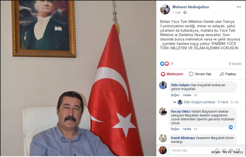 Yaptığı paylaşımda; "Birileri Yüce Türk Milletinin Devleti olan Türkiye Cumhuriyetinin verdiği, imkan ve selayeti, şahsi çıkarların da kullandıysa, mutlaka bu Yüce Türk Milletine ve Devletine Hesap verecektir. Sınır ötesinde bunca mehmetcik varsa ve şehit oluyorsa , içerideki hainlere kaçış yoktur" dedi.