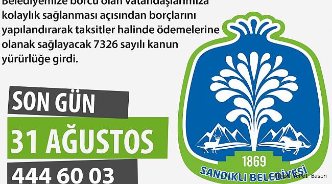 Belediyemize borcu olan vatandaşlarımıza kolaylık sağlanması açısından borçlarını yapılandırarak, taksitler halinde ödemelerine olanak sağlayacak 7326 sayılı kanun yürürlüğe girdi.Resmi gazetede yayınlanarak yürürlüğe giren kanun sayesinde belediyemize borcu olan vatandaşlarımız, 31/08/2021 tarihine kadar sandıklı belediyesi Mali Hizmetler Müdürlüğümüze ya da E-Belediye hizmetimizden başvuru yaparak bu hizmetten faydalanabilirler.Belediyemize Emlak, ÇTV, Su, Vergi Borcu, İlan reklam ücreti gibi benzeri borcu olan mükelleflerimiz, Mali Hizmetler Müdürlüğümüze bizzat başvuru yaparak ya da https://ebelediye.sandikli.bel.tr/webportal/ linkinden yapılandırma yapabilirler.
