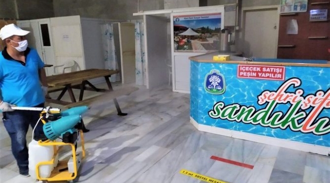 Sandıklı Belediyemiz tarafından vatandaşlarımızın kullanımına sunulan ilçe şehir hamamımızda dezenfekte çalışmalarımız aralıksız olarak devam ediyor.