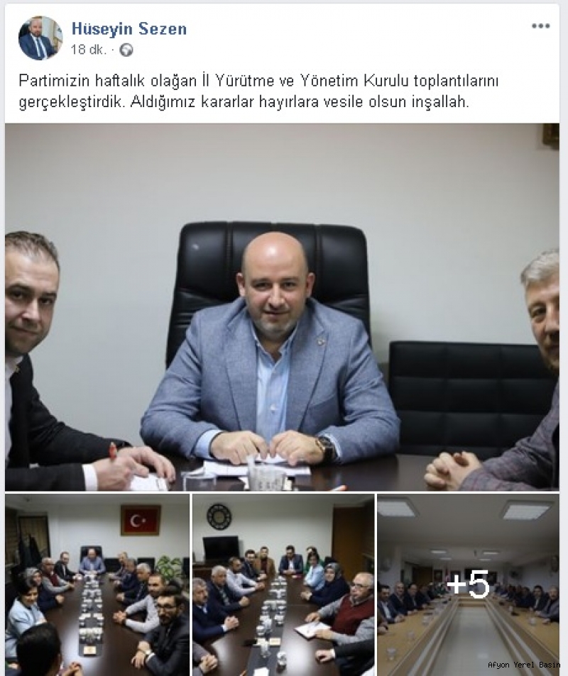 Afyonkarahisar Ak Parti İl Başkanı Av. Hüseyin Sezen, Sosyal Medya hesabından İl yürütme kurulu toplantısının gerçekleştiğini belirtti.
