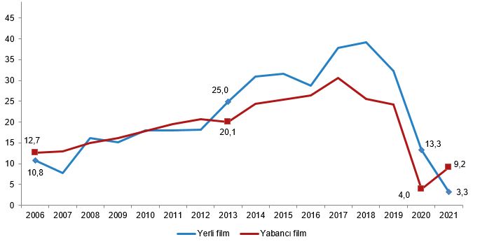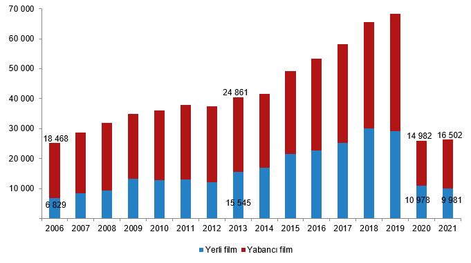 Gösterilen film sayısı 2021 yılında, 2020 yılına göre %2,0 artarak 26 bin 483 oldu. Aynı dönemde gösterilen yerli film sayısı %9,1 azalarak 9 bin 981 olurken, gösterilen yabancı film sayısı %10,1 artarak 16 bin 502 oldu.