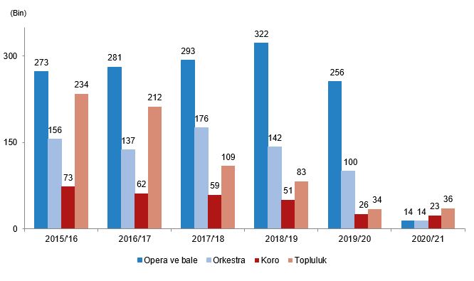 Opera ve bale seyirci sayısı 2020/'21 sezonunda, bir önceki sezona göre %94,5 azalarak 14 bin 32 oldu. Orkestra, koro ve topluluklarda seyirci sayısı %54,8 azalarak 72 bin 277 oldu. Orkestra seyirci sayısı geçen sezona göre %86,1 azalarak 13 bin 907'ye, koro seyirci sayısı %12,7 azalarak 22 bin 792'ye düşerken, topluluk seyirci sayısı ise %5,8 artarak 35 bin 578 oldu.