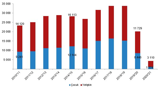 Çocuk ve yetişkin eser gösteri sayıları, 2011-2021