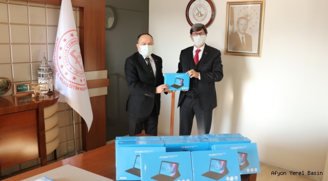 Türkiye Odalar ve Borsalar Birliği tarafından sürdürülen Klavyeli Tablet Kampanyası çerçevesinde 100 adet tablet, Afyonkarahisar Ticaret ve Sanayi Odası Yönetim Kurulu Başkanı Hüsnü Serteser tarafından İl Milli Eğitim Müdürü Metin Yalçın’a teslim edildi.Yeni tip koronavirüs salgını dolayısıyla uzaktan eğitim gören ve ihtiyaç sahibi olan öğrencilere ulaştırılmak üzere TOBB tarafından 30 Bin Klavyeli Tablet Kampanyası başlatılmıştı. TOBB Başkanı M. Rifat Hisarcıklıoğlu, kampanya duyurusunda “Bugünün küçük parmakları bir gün Türkiye’nin geleceğine imza atacaklar. TOBB ile Oda ve Borsalar olarak ihtiyaç sahibi öğrencilerimize 81 ilde Milli Eğitim Müdürlükleri aracılığıyla 30 bin Klavyeli Tablet hediye ediyoruz. Size inanıyor, sizin için çalışıyoruz” ifadelerini kullanmıştı.
