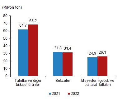Üretim miktarlarının, 2022 yılının ilk tahmininde bir önceki yıla göre tahıllar ve diğer bitkisel ürünlerde (yem bitkileri hariç) %10,4 artacağı, sebzelerde %1 azalacağı, meyveler, içecek ve baharat bitkilerinde %4,6 oranında artacağı tahmin edildi. Buna göre, üretim miktarlarının 2022 yılında yaklaşık olarak tahıllar ve diğer bitkisel ürünlerde 68,2 milyon ton, sebzelerde 31,4 milyon ton, meyveler, içecek ve baharat bitkilerinde 26,1 milyon ton olarak gerçekleşeceği tahmin edildi.