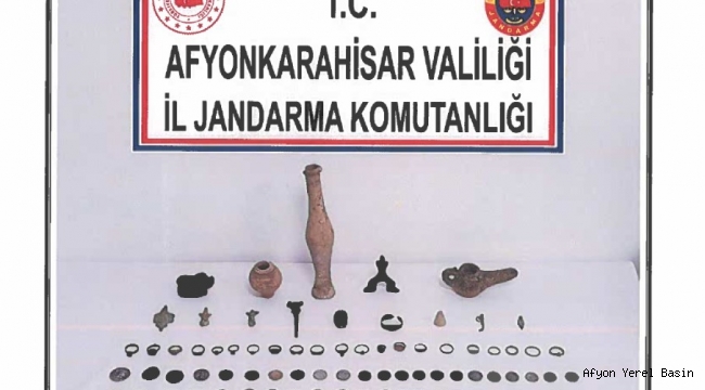 Afyonkarahisar İl Jandarma Komutanlığı ekiplerince yapılan çalışmalar neticesinde; Adana İli Seyhan İlçesi'nde ikamet eden S.G. isimli şüpheli şahsın elinde tarihi eser niteliği taşıyan objeler bulunduğu ve elinde bulunan bu objeleri satmak maksadıyla Adana ilinden Afyonkarahisar iline geleceği yönünde bilgi alınmıştır.23.01.2020 günü saat:08.00'da Afyonkarahisar Şehirlerarası Otobüs terminalinde gerçekleştirilen operasyonda, S.G. isimli şüpheli yakalanmış ve şüpheli şahısın üzerinde ve çantasında yapılan kontrollerde;(23) adet yüzük,(72) adet metal obje,(2) adet pişmiş toprak figürü,(1) adet bileklik,(1) adet ok ucu,(1) adet yağdanlık,(1) adet gözyaşı şişesi ve(156) adet sikke olmak üzere toplamda (193) parça tarihi eser ele geçirilmiştir. Olayla ilgili olarak yakalanan şüpheli şahıs hakkında yasal işlem başlatılmış olup, adli makamlara sevk edilmiştir.