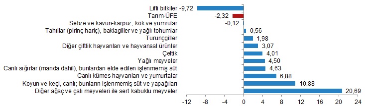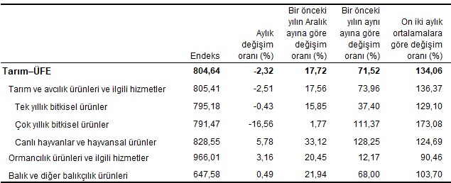 Bir önceki aya göre azalışın yüksek olduğu alt gruplar sırasıyla, %9,72 ile lifli bitkiler ve %0,12 ile sebze ve kavun-karpuz, kök ve yumrular oldu. Buna karşılık, aylık artışın yüksek olduğu alt gruplar ise %20,69 ile diğer ağaç ve çalı meyveleri ile sert kabuklu meyveler ve %10,88 ile koyun ve keçi, canlı; bunların işlenmemiş süt ve yapağıları oldu.