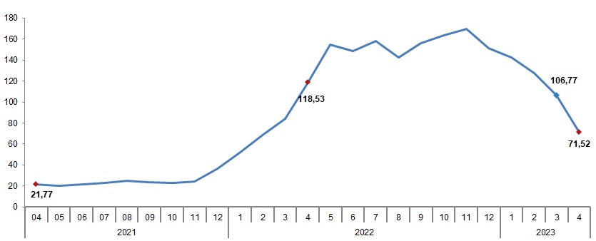 Tarım-ÜFE'de (2015=100), 2023 yılı Nisan ayında bir önceki aya göre %2,32 azalış, bir önceki yılın Aralık ayına göre %17,72 artış, bir önceki yılın aynı ayına göre %71,52 artış ve on iki aylık ortalamalara göre %134,06 artış gerçekleşti.