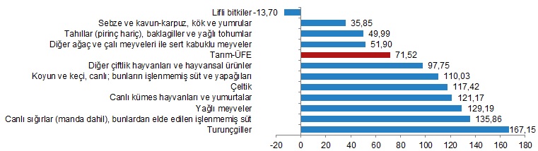 Yıllık artışın düşük olduğu alt gruplar sırasıyla, %35,85 ile sebze ve kavun-karpuz kök ve yumrular ve %49,99 ile tahıllar (pirinç hariç), baklagiller ve yağlı tohumlar oldu. Buna karşılık, yıllık artışın yüksek olduğu alt gruplar ise sırasıyla, %167,15 ile turunçgiller ve %135,86 ile canlı sığırlar (manda dahil), bunlardan elde edilen işlenmemiş süt oldu. Yıllık azalışın olduğu tek alt grup ise, %13,70 ile lifli bitkiler oldu.