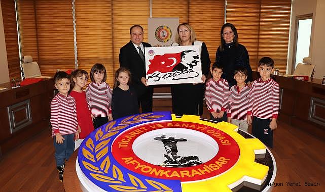 TED Afyon Koleji Anaokulu Müdürü Gülgün Yeşildağlar, Okul Öncesi 6 Yaş Öğretmeni Kübra Doğan Kabasoy ve öğrenciler, Afyonkarahisar Ticaret ve Sanayi Odası Yönetim Kurulu Başkanı Hüsnü Serteser’i ziyaret etti. Yeşildağlar ve Kabasoy, Serteser’e öğrenciler tarafından hazırlanan Atatürk portresini takdim etti.Ziyaret dolayısıyla teşekkür eden ATSO Yönetim Kurulu Başkanı Hüsnü Serteser, Yeşildağlar ve Kabasoy ile öğrencilere günün anısını yaşatmaları için hediye verdi.