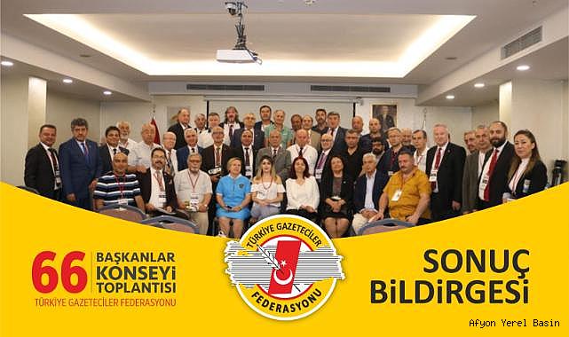 Türkiye Gazeteciler Federasyonu’nun (TGF) 66. Başkanlar Konseyi toplantısı Düzce Gazeteciler Cemiyeti’nin ev sahipliğinde 17-19 Mayıs tarihleri arasında Düzce Turan Otel Konferans Salonu’nda, Türkiye’nin çeşitli illerinden gelen 51 Gazeteciler Cemiyeti Başkanı’nın katılımı ile gerçekleştirilmiştir. Genel olarak medyanın sorunlarının tartışıldığı toplantı sonunda aşağıdaki hususların kamuoyu ile paylaşılmasına karar verilmiştir. 1. TGF olarak; Türk Devletinin milleti ile bölünmez bütünlüğüne, Atatürk ilke ve devrimlerinden vazgeçmeden Cumhuriyete ve Demokrasiye olan inancımızı bir kez daha yineleyerek; basın ve ifade özgürlüğü önüne konmak istenen tüm engelleri aşmaya kararlıyız. 2. ‘’Sosyal medyada düzenleme ve İnternet Gazeteciliği’’ adı ile çıkarılan yasada basına yeni bir sansür uygulamak istenmesini, Televizyon ve radyolar için ayrı Yasa çıkarılırken, İnternet Gazeteciliğinin Basın Kanunu’na adapte edilmek istenmesini, gazetecilerin eleştirel yazıları sonucu başına geleceklerle ilgili aba altından sopa gösterilmesini, Devlet eliyle gazeteci olmayanlara onurumuz olan, kimliğimiz Sarı Basın Kartı’nın dağıtılmasını, daha doğrusu meslek örgütleri yerine kamunun kimin gazeteci-kimin değil sorusuna karar vererek Basın Kartı vermesini; bütün bu kararlar alınırken meslek örgütlerinin ve özellikle 71 Cemiyet-dernek ve onların 20 binin üzerinde üyesini barındıran Türkiye’nin en güçlü meslek örgütlenmesi TGF’nin görüşünün dahi alınmamasını; üstelik meslekleri gazetecilik olmayan amaçlarının ne olduğunu bilmediğimiz meçhul kişilerin muhatap alınmasını