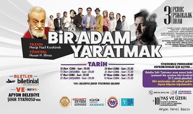 Afyonkarahisar Belediye Şehir Tiyatrosu, 10 Mart Cuma günü perdelerini depremzedeler için açacak. Belediye Şehir Tiyatromuz Belediye Başkanımız Mehmet Zeybek önderliğinde bağış kampanyası başlattı. Sezon boyunca oynanan tüm oyunların bilet satışından elde edilen gelirler depremzedeler için bağışlanacak.Afyonkarahisar Belediyesi afetzedelerin yanında olmayı sürdürüyor. Yapılan ayni yardım kampanyası başta olmak üzere lojistik destek sağlayan Belediyemiz afetten etkilenen bölgelerde yaraları sarmak için çalışıyor. Belediye Şehir Tiyatromuz da oyuncak kampanyası ardından şimdi de bilet satışlarından elde edilen gelir ile depremzedelerin yanında olmayı sürdürecek.OYUNLARIN BİLET GELİRLERİ DEPREMZEDELERE BAĞIŞLANACAK Belediye Başkanımız Mehmet Zeybek’in tensipleri ile başlatılan kampanya ile tiyatro gösterilerinden elde edilen tüm gelirler deprem bölgelerindeki vatandaşlarımıza bağışlanacak.20 Ocak’ta perdelerini açan Belediye Şehir Tiyatromuz, Necip Fazıl Kısakürek’in eseri “Bir Adam Yaratmak” adlı tiyatro oyununu 8 kez daha gösterime sunacak. 10 Mart Cuma günü saat 20.00’de Belediye Şehir Tiyatrosu Salonunda oynanacak oyun sırası ile 15 Mart, 17 Mart, 22 Mart, 24 Mart, 31 Mart, 7 Nisan ve 14 Nisan tarihlerinde sanatseverler ile buluşacak.Geliri depremzedelere gönderilecek oyunun bileti www.biletinial.com adresinden ya da Belediye Şehir Tiyatrosu salon girişinde temin edilebilecek. Kişi başı bilet fiyatı ise 50 TL olarak belirlendi.YARALARI BİRLİKTE SARACAĞIZKonuya ilişkin Afyonkarahisar Belediyesi sosyal medya hesaplarından yapılan açıklamada ise, “Belediye Şehir Tiyatromuz bilet satışlarından elde edilen gelirlerin tamamını depremzede kardeşlerimiz için bağışlayacak. Sizde bu hayıra vesile olmak için bilet satın alarak destek çıkabilirsiniz.Yaraları birlikte saracağız.” İfadelerine yer verildi.OYUN TARİHLERİ VE SAATİ10 Mart CUMA - Saat: 20.0015 Mart ÇARŞAMBA - Saat: 20.0017 Mart CUMA - Saat: 20.0022 Mart ÇARŞAMBA - Saat: 20.0024 Mart CUMA - Saat: 21.0031 Mart CUMA-Saat: 21.0007 Nisan CUMA - Saat: 21.0014 Nisan CUMA - Saat: 21.00