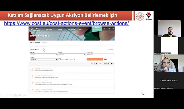 Afyon Kocatepe Üniversitesinin (AKÜ) kuruluşunun 30. yılı kutlamaları kapsamında Teknoloji Transfer Ofisi (TTO) tarafından “COST Aksiyonları Bilgilendirme Toplantısı” düzenlendi. Toplantıda TÜBİTAK Bilimsel Programlar Uzmanı Murat Tıltak katılımcılara işbirliği programları hakkında bilgi verdi.Çevrimiçi gerçekleştirilen ve bilim ile teknolojide Avrupa iş birliği programlarının anlatıldığı toplantı, TTO Koordinatörü Prof. Dr. Tayfan Uygunoğlu’nun selamlama konuşmasının ardından başladı.“Amaç farklı ülkelerde benzer konularda çalışan bilim insanlarını bir araya getirmek”Daha sonra söz alan TÜBİTAK Bilimsel Programlar Uzmanı Murat Tıltak “COST kuruluşu ve aksiyonları hakkında bilgi verdi. Tıltak, COST’un, Avrupalı araştırmacılar arasında etkileşim ve iş birliğini desteklemek amacıyla 1971 yılında kurulduğunu ve Türkiye’nin de kurucu ülkeler arasında yer aldığını ifade etti. COST oluşumunun, ulusal olarak desteklenen araştırma projelerinin yürütücülerinin Avrupa düzeyinde oluşturulmuş bilimsel ağlara dahil olmasını sağladığını anlatan Tıltak, “COST araştırmacılara araştırma desteği vermez. Ancak araştırmacılara kendi alanlarında çalışan bilim insanları ile bir araya gelmelerini amaçlamaktadır. Türkiye’deki bilimsel koordinatörlüğünü de TÜBİTAK gerçekleştirmekte. COST’a üye 40 ülke bulunmakta” dedi.