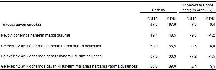 Türkiye İstatistik Kurumu ve Türkiye Cumhuriyet Merkez Bankası işbirliği ile yürütülen tüketici eğilim anketi sonuçlarından hesaplanan mevsim etkilerinden arındırılmış tüketici güven endeksi, Mayıs ayında bir önceki aya göre %0,4 oranında arttı; Nisan ayında 67,3 olan endeks, Mayıs ayında 67,6 oldu.