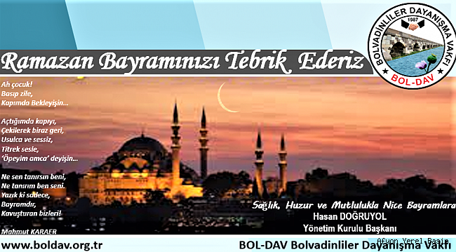 Bir avuç dua, bir kucak sevgi, sıcak bir mesaj kapatır mesafeleri, birleştirir gönülleri, bir sıcak gülümseme, bir ufak hediye daha da yaklaştırır bizi birbirimize. Kalbiniz nur, eviniz huzur dolsun. Ramazan Bayramınız mübarek ve bereketli olsun! Malumlarınız Toplumları geliştiren en önemli hususlar sağlıklı iletişimle başlar. Toplum olarak ekonomik, sosyal ve kültürel gelişmede başarının sırrı birlik ve beraberlik içerisinde organize olmakta olduğunun farkında olmamızda saklıdır.Toplumsal ihtiyaçlarda birlikte düşünüp, birlikte hareket etmek doğru sonuçlara ulaşmanın kaynağıdır. Memleketimiz için yapılacak daha çok işimiz var olduğunu biliyoruz. Onları birlikte gerçekleştirmenin sırrı konfor alanlarımızın terkiyle başlar.İyi niyetimizi, akıl, bilgi, irade, istişare ve kararlığımızı merkeze alarak Bolvadin için fikir, düşünce ve hizmet üretmeye devam etmek ana şiarımızdır. Yeter ki birbirimize güvenelim, birbirimize destek verelim, güzel olanı, doğru olanı, hakka ve hakikate uygun olanı takdir etme, tebrik etme, teşekkür etme duyarlılığı kazanalım.Bu vesile ile tekrar bu manevi iklimlerde siz sevgili hemşerilerimiz ve dostlarımızla sağlık ve sıhhat içerisinde nice Ramazanlarda ve Bayramlarda birlikte olmak duasıyla saygılarımı, sevgilerimi ve muhabbetlerimi sunuyorum. Allaha emanet olunuz. Hasan DOĞRUYOLBol-Dav Bolvadinliler Dayanışma VakfıYönetim Kurulu Başkanı