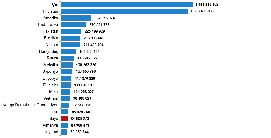Kaynak: Birleşmiş Milletler Dünya Nüfus Beklentileri, 2019TÜİK, Adrese Dayalı Nüfus Kayıt Sistemi, 2021 Toplam doğurganlık hızının en yüksek olduğu ülke 6,51 çocuk ile Nijer oldu Birleşmiş Milletler dünya nüfus tahminlerine göre ülkelerin toplam doğurganlık hızları incelendiğinde, 2021 yılında en yüksek toplam doğurganlık hızına sahip olan ülke, 6,51 çocuk ile Nijer oldu. Bu ülkeyi 5,66 çocuk ile Somali ve 5,46 çocuk ile Kongo Demokratik Cumhuriyeti ve Mali izledi. Toplam doğurganlık hızının en düşük olduğu ülke, 1,08 çocuk ile Kore Cumhuriyeti oldu. Bu ülkeyi 1,22 çocuk ile Bosna Hersek ve 1,24 çocuk ile Singapur izledi. Toplam doğurganlık hızı dünya ortalaması, 2021 yılında 2,42 çocuk oldu. Türkiye'nin toplam doğurganlık hızının 1,70 çocuk ile dünya ortalamasının altında kaldığı görüldü. Toplam doğurganlık hızının en yüksek ve en düşük olduğu 10 ülke, 2021