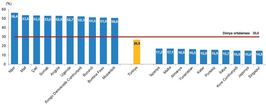 Yıl ortası nüfuslardır. Çocuk nüfus oranının en yüksek olduğu ülke Nijer oldu Birleşmiş Milletler dünya nüfus tahminlerine göre ülkelerin toplam nüfusları içindeki 0-17 yaş grubu çocuk nüfus oranları incelendiğinde, 2021 yılında en yüksek çocuk nüfus oranına sahip olan ülke, %56,4 ile Nijer oldu. Bu ülkeyi %53,8 ile Mali ve %53,2 ile Çad izledi. Çocuk nüfus oranının en düşük olduğu ülke, %14,9 ile Singapur oldu. Bu ülkeyi %15,0 ile Japonya ve Kore Cumhuriyeti, %15,7 ile İtalya izledi. Çocuk nüfus oranı dünya ortalaması, 2021 yılında %30,0 oldu. Türkiye'deki çocuk nüfus oranının %26,9 ile dünya çocuk nüfus ortalamasının altında kaldığı görüldü. Çocuk nüfus oranının en yüksek ve en düşük olduğu 10 ülke, 2021
