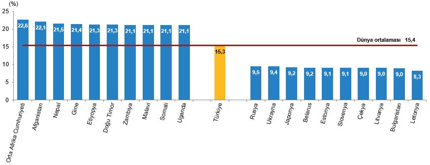 TÜİK, Adrese Dayalı Nüfus Kayıt Sistemi, 2021 Genç nüfus oranının en yüksek olduğu ülke Orta Afrika Cumhuriyeti oldu Birleşmiş Milletler dünya nüfus tahminlerine göre ülkelerin toplam nüfusları içindeki 15-24 yaş grubu genç nüfus oranları incelendiğinde, 2021 yılında en yüksek genç nüfus oranına sahip olan ülke, %22,6 ile Orta Afrika Cumhuriyeti oldu. Bu ülkeyi %22,1 ile Afganistan ve %21,5 ile Nepal izledi. Genç nüfus oranının en düşük olduğu ülke, %8,3 ile Letonya oldu. Bu ülkeyi %9,0 ile Bulgaristan, Litvanya ve Çekya, %9,1 ile Slovenya ve Estonya izledi. Genç nüfus oranı dünya ortalaması, 2021 yılında %15,4 oldu. Türkiye'nin genç nüfus oranın %15,3 ile dünya genç nüfus ortalamasının hemen altında olduğu görüldü. Genç nüfus oranının en yüksek ve en düşük olduğu 10 ülke, 2021