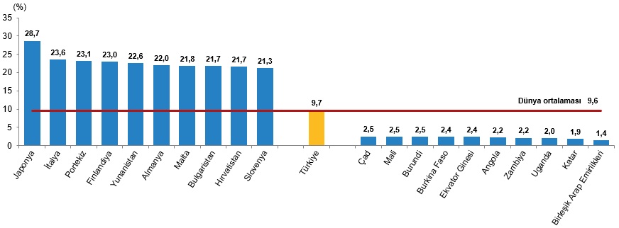 TÜİK, Adrese Dayalı Nüfus Kayıt Sistemi, 2021 Yaşlı nüfus oranının en yüksek olduğu ülke Japonya oldu Birleşmiş Milletler dünya nüfus tahminlerine göre ülkelerin toplam nüfusları içindeki 65 ve daha yukarı yaştaki yaşlı nüfus oranları incelendiğinde, 2021 yılında en yüksek yaşlı nüfus oranına sahip olan ülke, %28,7 ile Japonya oldu. Bu ülkeyi %23,6 ile İtalya ve %23,1 ile Portekiz izledi. Yaşlı nüfus oranının en düşük olduğu ülke, %1,4 ile Birleşik Arap Emirlikleri oldu. Bu ülkeyi %1,9 ile Katar ve %2,0 ile Uganda izledi. Yaşlı nüfus oranı dünya ortalaması, 2021 yılında %9,6 oldu. Türkiye'nin yaşlı nüfus oranının %9,7 ile dünya yaşlı nüfus ortalamasının hemen üzerinde olduğu görüldü. Yaşlı nüfus oranının en yüksek ve en düşük olduğu 10 ülke, 2021