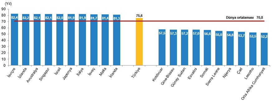 TÜİK, Doğum İstatistikleri, 2021 Erkekler için doğuşta beklenen yaşam süresinin en yüksek olduğu ülke İsviçre oldu Birleşmiş Milletler dünya nüfus tahminlerine göre 2020-2025 dönemi için doğuşta beklenen yaşam süresinin dünya genelinde 73,2 yıl, erkekler için 70,8 yıl ve kadınlar için 75,6 yıl olduğu görüldü. Ülkelerin 2020-2025 dönemi için doğuşta beklenen yaşam süreleri incelendiğinde, erkekler için doğuşta beklenen yaşam süresinin en yüksek olduğu ülke, 82,4 yıl ile İsviçre oldu. Bu ülkeyi 82,2 yıl ile İzlanda ve 82,1 yıl ile Avustralya ve Singapur izledi. Erkekler için doğuşta beklenen yaşam süresinin en düşük olduğu ülke, 52,2 yıl ile Orta Afrika Cumhuriyeti oldu. Bu ülkeyi 52,5 yıl ile Lesotho ve 53,7 yıl ile Çad izledi. Türkiye'nin erkekler için 75,6 yıl olan doğuşta beklenen yaşam süresinin dünya ortalamasından yüksek olduğu görüldü. Erkekler için doğuşta beklenen yaşam süresi, 2020-2025