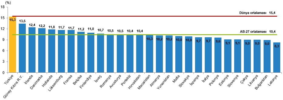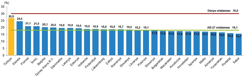TÜİK, Adrese Dayalı Nüfus Kayıt Sistemi, 2021 Türkiye'nin genç nüfus oranının Avrupa Birliği üye ülkelerinden yüksek olduğu görüldü Birleşmiş Milletler dünya nüfus tahminlerine göre AB üyesi 27 ülkenin genç nüfus oranları incelendiğinde, 2021 yılında en yüksek genç nüfus oranına sahip olan ülkelerin sırasıyla %13,5 ile Güney Kıbrıs Rum Yönetimi, %12,4 ile İrlanda ve %12,2 ile Danimarka olduğu görüldü. En düşük genç nüfus oranına sahip olan ülkelerin ise sırasıyla %8,3 ile Letonya, %9,0 ile Bulgaristan, Litvanya ve Çekya, %9,1 ile Slovenya ve Estonya olduğu görüldü. Türkiye'nin genç nüfus oranının %15,3 ile AB üyesi 27 ülkenin genç nüfus oranlarından daha yüksek olduğu görüldü. Genç nüfus oranının AB üye ülkeleri ile karşılaştırması, 2021