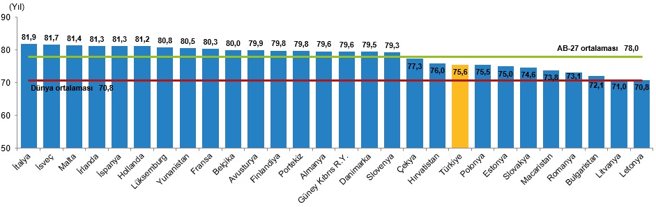 Kaynak: Birleşmiş Milletler Dünya Nüfus Beklentileri, 2019 Erkekler için doğuşta beklenen yaşam süresinin en yüksek olduğu AB ülkesi İtalya oldu Birleşmiş Milletler dünya nüfus tahminlerine göre AB üyesi 27 ülkenin erkekler için doğuşta beklenen yaşam süreleri incelendiğinde, 2020-2025 dönemi erkekler için doğuşta beklenen yaşam süresinin en yüksek olduğu ülke, 81,9 yıl ile İtalya oldu. Bu ülkeyi 81,7 yıl ile İsveç ve 81,4 yıl ile Malta izledi. Erkekler için doğuşta beklenen yaşam süresinin en düşük olduğu ülke, 70,8 yıl ile Letonya oldu. Bu ülkeyi 71,0 yıl ile Litvanya ve 72,1 yıl ile Bulgaristan izledi. Türkiye'nin erkekler için 75,6 yıl olan doğuşta beklenen yaşam süresinin AB üye ülkeleri ortalamasından düşük olduğu görüldü. Erkekler için doğuşta beklenen yaşam süresinin AB üye ülkeleri ile karşılaştırması, 2021