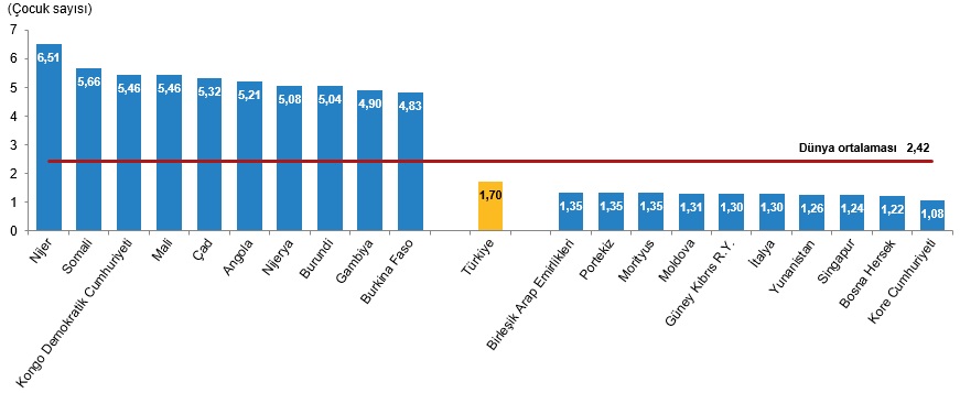 TÜİK, Adrese Dayalı Nüfus Kayıt Sistemi, 2021 Toplam doğurganlık hızının en yüksek olduğu ülke 6,51 çocuk ile Nijer oldu Birleşmiş Milletler dünya nüfus tahminlerine göre ülkelerin toplam doğurganlık hızları incelendiğinde, 2021 yılında en yüksek toplam doğurganlık hızına sahip olan ülke, 6,51 çocuk ile Nijer oldu. Bu ülkeyi 5,66 çocuk ile Somali ve 5,46 çocuk ile Kongo Demokratik Cumhuriyeti ve Mali izledi. Toplam doğurganlık hızının en düşük olduğu ülke, 1,08 çocuk ile Kore Cumhuriyeti oldu. Bu ülkeyi 1,22 çocuk ile Bosna Hersek ve 1,24 çocuk ile Singapur izledi. Toplam doğurganlık hızı dünya ortalaması, 2021 yılında 2,42 çocuk oldu. Türkiye'nin toplam doğurganlık hızının 1,70 çocuk ile dünya ortalamasının altında kaldığı görüldü. Toplam doğurganlık hızının en yüksek ve en düşük olduğu 10 ülke, 2021