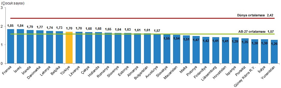 TÜİK, Doğum İstatistikleri, 2021 Toplam doğurganlık hızının en yüksek olduğu AB ülkesi 1,85 çocuk ile Fransa oldu Birleşmiş Milletler dünya nüfus tahminlerine göre AB üyesi 27 ülkenin toplam doğurganlık hızları incelendiğinde, 2021 yılında en yüksek toplam doğurganlık hızına sahip olan ülke, 1,85 çocuk ile Fransa oldu. Bu ülkeyi 1,84 çocuk ile İsveç ve 1,79 çocuk ile İrlanda izledi. Toplam doğurganlık hızının en düşük olduğu ülke, 1,26 çocuk ile Yunanistan oldu. Bu ülkeyi 1,30 çocuk ile İtalya ve Güney Kıbrıs Rum Yönetimi, 1,35 çocuk ile Portekiz izledi. Toplam doğurganlık hızı 2021 yılında 1,70 olan Türkiye, AB üyesi ülkeler arasında 7. sırada yer aldı. Toplam doğurganlık hızının AB üye ülkeleri ile karşılaştırması, 2021