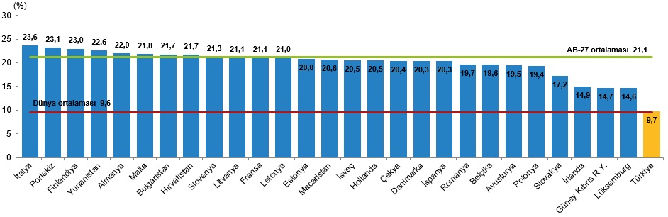 TÜİK, Adrese Dayalı Nüfus Kayıt Sistemi, 2021 Türkiye'nin yaşlı nüfus oranının Avrupa Birliği üye ülkelerinden düşük olduğu görüldü Birleşmiş Milletler dünya nüfus tahminlerine göre AB üyesi 27 ülkenin yaşlı nüfus oranları incelendiğinde, 2021 yılında en yüksek yaşlı nüfus oranına sahip olan ülkelerin sırasıyla %23,6 ile İtalya, %23,1 ile Portekiz ve %23,0 ile Finlandiya olduğu görüldü. En düşük yaşlı nüfus oranına sahip olan ülkelerin ise sırasıyla %14,6 ile Lüksemburg, %14,7 ile Güney Kıbrıs Rum Yönetimi, %14,9 ile İrlanda olduğu görüldü. Türkiye'nin yaşlı nüfus oranının %9,7 ile AB üyesi 27 ülkenin yaşlı nüfus oranlarından daha düşük olduğu görüldü. Yaşlı nüfus oranının AB üye ülkeleri ile karşılaştırması, 2021