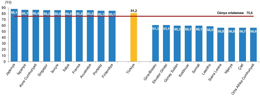 Kaynak: Birleşmiş Milletler Dünya Nüfus Beklentileri, 2019 Kadınlar için doğuşta beklenen yaşam süresinin en yüksek olduğu ülke Japonya oldu Ülkelerin 2020-2025 dönemi için doğuşta beklenen yaşam süreleri incelendiğinde, kadınlar için doğuşta beklenen yaşam süresinin en yüksek olduğu ülke, 88,1 yıl ile Japonya oldu. Bu ülkeyi 86,7 yıl ile İspanya ve 86,4 yıl ile Kore Cumhuriyeti izledi. Doğuşta beklenen yaşam süresinin en düşük olduğu ülke, 56,6 yıl ile Orta Afrika Cumhuriyeti oldu. Bu ülkeyi 56,7 yıl ile Çad ve 56,8 yıl ile Nijerya ve Sierra Leone izledi. Türkiye'nin kadınlar için 81,2 yıl olan doğuşta beklenen yaşam süresinin dünya ortalamasından yüksek olduğu görüldü. Kadınlar için doğuşta beklenen yaşam süresi, 2020-2025
