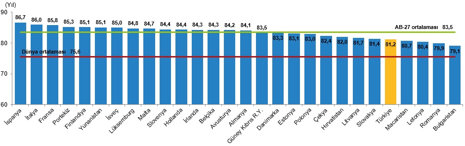 Kaynak: Birleşmiş Milletler Dünya Nüfus Beklentileri, 2019 Kadınlar için doğuşta beklenen yaşam süresinin en yüksek olduğu AB ülkesi İspanya oldu Birleşmiş Milletler dünya nüfus tahminlerine göre AB üyesi 27 ülkenin kadınlar için doğuşta beklenen yaşam süreleri incelendiğinde, 2020-2025 dönemi kadınlar için doğuşta beklenen yaşam süresinin en yüksek olduğu ülke, 86,7 yıl ile İspanya oldu. Bu ülkeyi 86,0 yıl ile İtalya ve 85,8 yıl ile Fransa izledi. Doğuşta beklenen yaşam süresinin en düşük olduğu ülke, 79,1 yıl ile Bulgaristan oldu. Bu ülkeyi 79,9 yıl ile Romanya ve 80,4 yıl ile Letonya izledi. Türkiye'nin kadınlar için 81,2 yıl olan doğuşta beklenen yaşam süresinin AB üye ülkeleri ortalamasından düşük olduğu görüldü. Kadınlar için doğuşta beklenen yaşam süresinin AB üye ülkeleri ile karşılaştırması, 2021