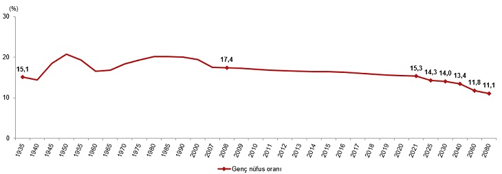Adrese Dayalı Nüfus Kayıt Sistemi (ADNKS) sonuçlarına göre 2021 yılı sonu itibarıyla Türkiye'nin toplam nüfusu 84 milyon 680 bin 273 kişi iken 15-24 yaş grubundaki genç nüfus 12 milyon 971 bin 289 kişi oldu. Genç nüfus, toplam nüfusun %15,3'ünü oluşturdu. Genç nüfusun %51,3'ünü erkek nüfus, %48,7'sini ise kadın nüfus oluşturdu. Nüfus projeksiyonlarına göre genç nüfusun toplam nüfus içindeki oranının 2025 yılında %14,3, 2030 yılında %14,0, 2040 yılında %13,4, 2060 yılında %11,8 ve 2080 yılında %11,1'e düşeceği öngörüldü. Genç nüfusun toplam nüfus içindeki oranı, 1935-2080