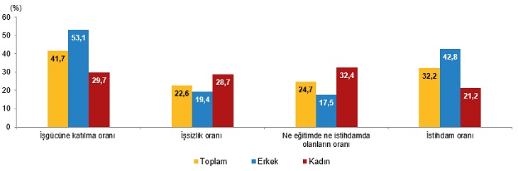 Kaynak: Milli Eğitim Bakanlığı, Milli Eğitim İstatistikleri, Örgün Eğitim, 2020/'21 Ne eğitimde ne istihdamda olan gençlerin oranı %24,7 oldu Hanehalkı işgücü araştırması sonuçlarına göre gençlerde işgücüne katılma oranı, 2020 yılında %39,1 iken 2021 yılında %41,7 oldu. Genç erkeklerde işgücüne katılma oranı 2020 yılında %50,1 iken 2021 yılında %53,1, genç kadınlarda ise bu oran 2020 yılında %27,5 iken 2021 yılında %29,7 oldu. Gençlerde işsizlik oranı, 2020 yılında %25,3 iken 2021 yılında %22,6 oldu. Genç erkeklerde işsizlik oranı 2020 yılında %22,6 iken 2021 yılında %19,4, genç kadınlarda ise bu oran 2020 yılında %30,3 iken 2021 yılında %28,7 oldu. Ne eğitimde ne istihdamda olan gençlerin oranı 2020 yılında %28,3 iken 2021 yılında %24,7 oldu. Genç erkeklerde ne eğitimde ne istihdamda olanların oranı 2020 yılında %21,2 iken 2021 yılında %17,5, genç kadınlarda ise bu oran 2020 yılında %35,7 iken 2021 yılında %32,4 oldu. Cinsiyete göre kurumsal olmayan genç nüfusun işgücü durumu, 2021