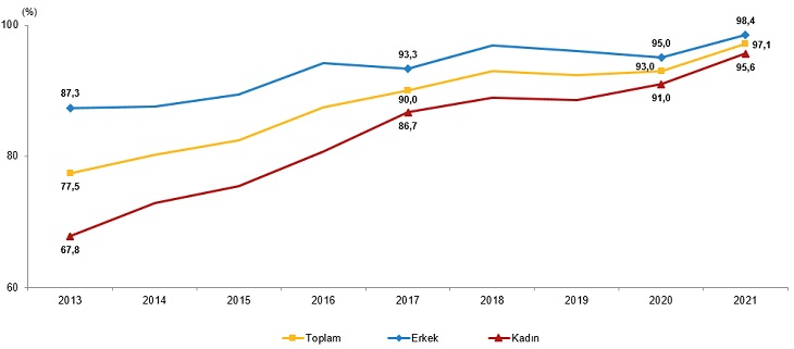 Grafikteki rakamlar yuvarlamadan dolayı toplamı vermeyebilir. Gençlerin %76,0'sı işinden memnun olduğunu belirtti Yaşam memnuniyeti araştırması sonuçlarına göre 2021 yılında, gençlerin %76,0'sı çalıştığı işinden memnun olduğunu, %42,3'ü elde ettiği kazançtan memnun olduğunu belirtti. Genç erkeklerde çalışılan işten duyulan memnuniyet oranı %77,7, elde edilen kazançtan memnuniyet oranı %43,1 olurken genç kadınlarda ise bu oranlar %72,6 ve %40,7 olarak gerçekleşti. Gençlerin %59,2'si almış olduğu eğitimden memnun olduğunu belirtti Yaşam memnuniyeti araştırması sonuçlarına göre 2021 yılında, gençlerin %59,2'si şimdiye kadar almış olduğu eğitimden memnun olduğunu belirtti. Bu oran genç erkeklerde %56,3 iken genç kadınlarda %62,3 oldu. İnternet kullanan gençlerin oranı %97,1 oldu Hanehalkı bilişim teknolojileri kullanım araştırması sonuçlarına göre İnternet kullanım oranı, 16-24 yaş grubundaki genç nüfusta 2020 yılında %93,0 iken 2021 yılında %97,1 oldu. İnternet kullanım oranı, genç erkeklerde 2020 yılında %95,0 iken 2021 yılında %98,4, genç kadınlarda ise 2020 yılında %91,0 iken 2021 yılında %95,6 oldu. Cinsiyete göre gençlerin İnternet kullanım oranı, 2013-2021