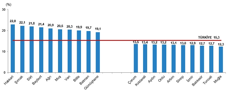 Kaynak: Avrupa Birliği İstatistik Ofisi (Eurostat) Veri Tabanı, 2021TÜİK, Adrese Dayalı Nüfus Kayıt Sistemi, 2021 Genç nüfus oranının en yüksek olduğu il %22,8 ile Hakkari oldu ADNKS sonuçlarına göre 2021 yılında genç nüfus oranının en yüksek olduğu il, %22,8 ile Hakkari oldu. Bu ili %22,1 ile Şırnak ve %21,8 ile Siirt izledi. Genç nüfus oranının en yüksek ve en düşük olduğu 10 il, 2021
