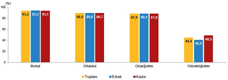 Kaynak: TÜİK, Adrese Dayalı Nüfus Kayıt Sistemi, 2021 Evli olan genç kadınların oranı, evli olan genç erkeklerin oranının yaklaşık 4 katı oldu Genç nüfus yasal medeni duruma göre incelendiğinde, cinsiyetler arasında önemli farklılıklar olduğu görüldü. Genç erkek nüfusun 2021 yılında %96,2'sinin hiç evlenmemiş, %3,8'inin resmi nikahla evli, %0,1'inin boşanmış olduğu görülürken genç kadın nüfusun %84,9'unun hiç evlenmemiş, %14,7'sinin resmi nikahla evli, %0,4'ünün ise boşanmış olduğu görüldü. Kadınlarda yükseköğretimde net okullaşma oranı %48,5 oldu Türkiye'de 2019/'20 öğretim yılında %43,4 olan yükseköğretim net okullaşma oranı, 2020/'21 öğretim yılında %44,4'e yükseldi. Yükseköğretim net okullaşma oranı cinsiyete göre incelendiğinde, erkeklerde bu oran %40,6'dan %40,5'e düşerken kadınlarda %46,3'ten %48,5'e yükseldi. Eğitim seviyesi ve cinsiyete göre net okullaşma oranı, 2020/'21