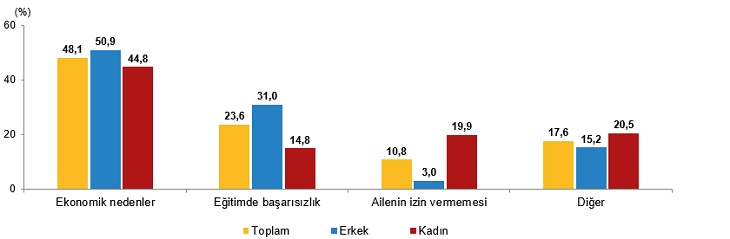 Kaynak: TÜİK, İşgücü İstatistikleri, 2021 İstihdamdaki gençlerin %51,0'i hizmet sektöründe yer aldı Hanehalkı işgücü araştırması sonuçlarına göre genç nüfusun istihdam oranı, 2020 yılında %29,2 iken 2021 yılında %32,2'ye yükseldi. Genç erkeklerde istihdam oranı 2020 yılında %38,8 iken 2021 yılında %42,8, genç kadınlarda bu oran 2020 yılında %19,2 iken 2021 yılında %21,2 oldu. Genç nüfusun istihdamı sektörlere göre incelendiğinde, istihdam edilen gençlerin 2021 yılında %18,2'sinin tarım sektöründe, %30,8'inin sanayi sektöründe, %51,0'inin ise hizmet sektöründe yer aldığı görüldü. İstihdam edilen genç erkeklerin %16,8'inin tarım sektöründe, %35,4'ünün sanayi sektöründe, %47,7'sinin hizmet sektöründe yer aldığı görülürken genç kadınların %21,0'inin tarım, %21,0'inin sanayi, %58,0'inin ise hizmet sektöründe yer aldığı görüldü. Eğitime devam etmek istemesine rağmen eğitimini yarıda bırakan gençlerin oranı %7,6 oldu Türkiye Aile Yapısı Araştırması 2021 sonuçlarına göre 15-24 yaş grubundaki genç nüfus içinde eğitimine devam etmek istemesine rağmen (üniversite dahil) eğitimini yarıda bırakan gençlerin oranı %7,6 oldu. Genç erkeklerde bu oran %8,0 iken genç kadınlarda ise %7,1 oldu. Eğitimini yarıda bırakan gençlerin eğitimini yarıda bırakma nedenleri incelendiğinde ilk sırayı %48,1 ile ekonomik nedenler alırken, bunu %23,6 ile eğitimdeki başarısızlık ve %10,8 ile ailenin izin vermemesi takip etti. Cinsiyete göre eğitimini yarıda bırakan gençlerin eğitimini yarıda bırakma nedenleri, 2021