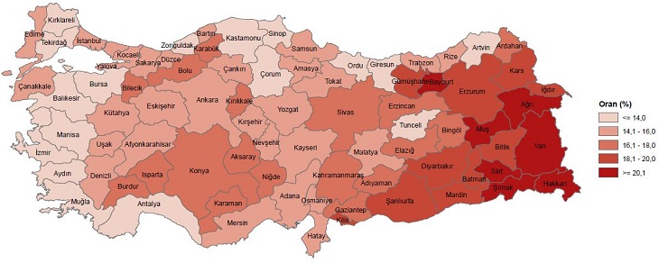 TÜİK, Adrese Dayalı Nüfus Kayıt Sistemi, 2021 Genç nüfus oranının en yüksek olduğu il %22,8 ile Hakkari oldu ADNKS sonuçlarına göre 2021 yılında genç nüfus oranının en yüksek olduğu il, %22,8 ile Hakkari oldu. Bu ili %22,1 ile Şırnak ve %21,8 ile Siirt izledi. Genç nüfus oranının en yüksek ve en düşük olduğu 10 il, 2021