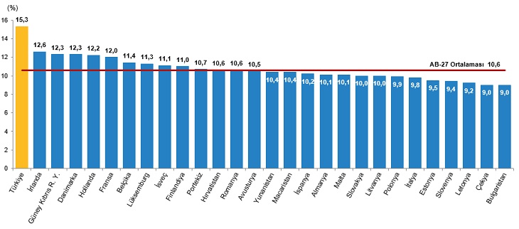 TÜİK, 2018 Nüfus Projeksiyonları, 2025-2080 Türkiye'nin genç nüfus oranının Avrupa Birliği üye ülkelerinden yüksek olduğu görüldü Türkiye'nin genç nüfus oranının %15,3 ile Avrupa Birliği üyesi 27 ülkenin genç nüfus oranlarından daha yüksek olduğu görüldü. Avrupa Birliği üyesi 27 ülkenin genç nüfus oranları incelendiğinde, 2021 yılında genç nüfus ortalaması %10,6 oldu. AB üye ülkeleri arasında en yüksek genç nüfus oranına sahip olan ülkelerin sırasıyla %12,6 ile İrlanda, %12,3 ile Güney Kıbrıs Rum Yönetimi ve Danimarka olduğu, en düşük genç nüfus oranına sahip olan ülkelerin ise sırasıyla %9,0 ile Bulgaristan ve Çekya, %9,2 ile Letonya olduğu görüldü. Genç nüfus oranının Avrupa Birliği üye ülkeleri ile karşılaştırması, 2021